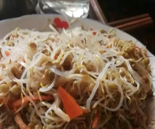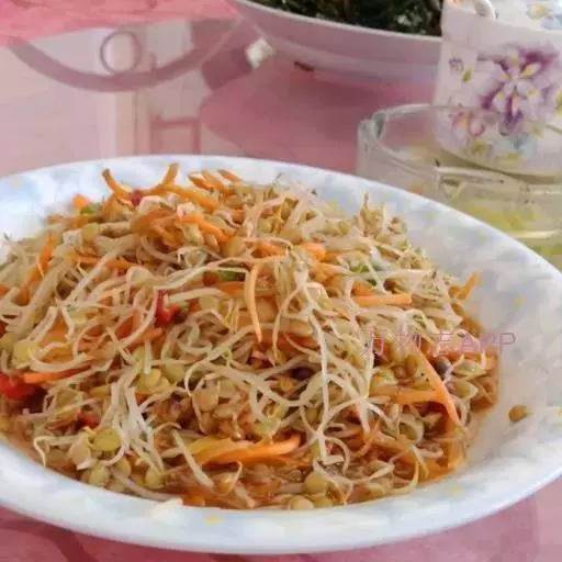 3、将豆芽菜烫至熟,放入碗中,将1/4个水煮蛋放入,最后撒上红葱头酥、九层塔及辣椒片即完成。