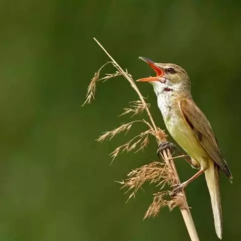 沙哑与甜美短句的响亮混合,比大苇莺声快,并间杂模仿叫声。鸣声能持续数分钟之久而无间断。叫声包括沙哑颤鸣声tue及似责骂的嘟声。