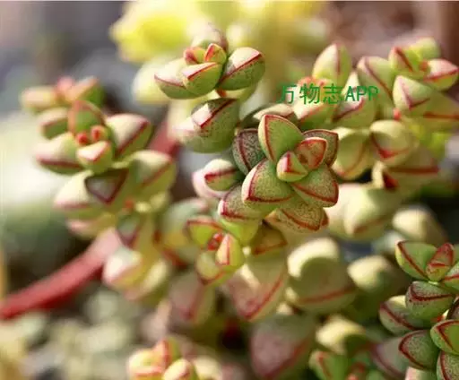 全株无毛,株高在原产地为20厘米,但栽培中相当低矮。从基部丛生很多分枝,茎和分枝初白色肉质状,后变褐色,下部中空。叶无柄,交互对生,长1厘米,宽和厚均为0.6厘米,正面平背面浑圆似半球状,肉质坚硬。黄绿色叶缘呈红色。花白一柠檬黄色。