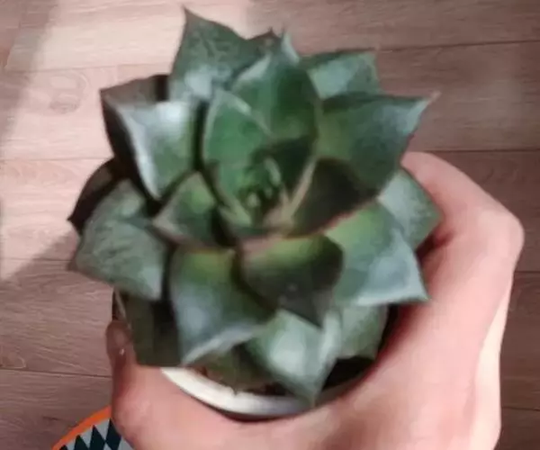 叶片光洁,底色灰绿,均匀密布深红斑纹,背部龙骨线凸起、呈棕色,三角卵形,先端尖锐,长3-4厘米。莲座直径8-12厘米。花长10-12毫米,亮红色。