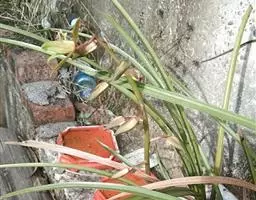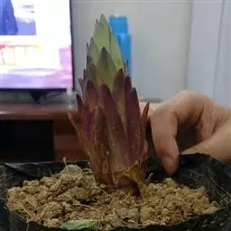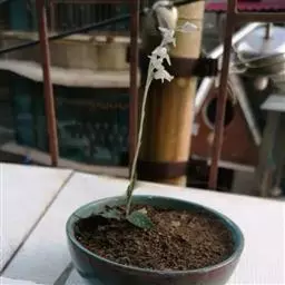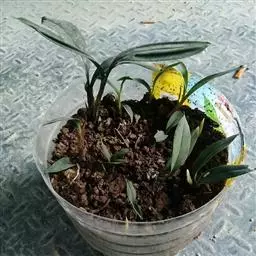 方法一 准备好兰盆及植料后,将兰株倒拿(根在上,叶在下)放于水龙头下以慢水冲洗,但水压切忌过强,以免伤兰根及叶子。用拇指和食指抓住兰头,小指抵住盆缘,用竹筷将根固定,当放入盆内时,尽量不要让根接触到盆壁。将豆粒大的混合石砾倒入盆底至三分之一处。然后倒入中粒植料至五分之四处,填实和尽量不要留下空间。将竹筷拔出,并摇实盆中植料。填实植料后,再用大粒植料埴入至距盆缘1.5厘米处。最后再倒入豆粒大植料,以将假鳞茎全部埋入土中为度,然后充分摇实。用压土工具轻压植料,并将表面弄平。种植完毕后,植料在盆中以中央稍高为好。