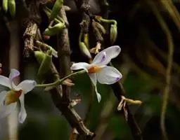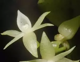 花瓣白色,无毛,稍斜菱状线形,长(2-)2.5厘米,宽3-4毫米,先端急尖;唇瓣白色,线状披针形,长1.8-2厘米,基部凹陷呈囊状,内面具多数腺毛,前部伸长,舌状,长为囊长的2倍,先端近急尖且向下卷曲;蕊柱短;花药三角状披针形,长1-1.2厘米;花粉团倒披针形,长1.2-1.6厘米;蕊喙细长,长1-1.2厘米,叉状2裂;柱头1个,位于蕊喙下方。花期2-7月。