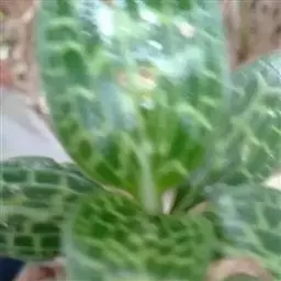 大花斑叶兰植株高5-15厘米。根状茎伸长,茎状,匍匐,具节。茎直立,绿色,具4-5枚叶。叶片卵形或椭圆形,长2-4厘米,宽1-2.5厘米,上面绿色,具白色均匀细脉连接成的网状脉纹,背面淡绿色,有时带紫红色,具柄;叶柄长1-2.5厘米,基部扩大成抱茎的鞘。