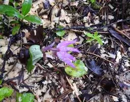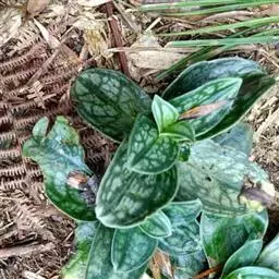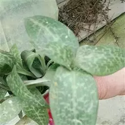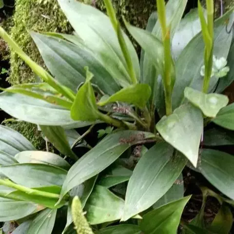 大花斑叶兰(学名:Goodyera biflora (Lindl.) Hook. f.):植株高5-15厘米。根状茎伸长,茎状,匍匐,具节。茎直立,绿色,具4-5枚叶。叶片卵形或椭圆形,长2-4厘米,宽1-2.5厘米,上面绿色,背面淡绿色,有时带紫红色,具柄。总状花序通常具2朵花,常偏向一侧;花大,长管状,白色或带粉红色,花瓣白色,无毛,稍斜菱状线形,长(2-)2.5厘米,宽3-4毫米,先端急尖;唇瓣白色,线状披针形。花期2-7月。