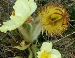 花通常4-5朵,稀达18朵,生最上部茎生叶腋内,有时也生于下部茎生叶腋内;花梗长(3-)6-37(-52)厘米,果时延长。花芽宽卵形;萼片舟状,长约3厘米,外面被毛,里面无毛,具数十条明显的纵脉;花瓣6-8,近圆形至倒卵形,长3-7厘米,宽3-5厘米,黄色或稀白色,干时具褐色纵条纹;花丝线形,长0.5-1.5厘米,金黄色或成熟时为褐色,花药卵形至长圆形,长1-2(-4)毫米,橘红色,后为黄色至黑色;子房宽椭圆状长圆形、卵形或椭圆形,密被金黄色、紧贴、通常具多短分枝的长硬毛,花柱极短至长1.3厘米,无毛,柱头头状,4-9裂下延至花柱上,略辐射于子房顶。蒴果宽椭圆状长圆形至椭圆形,长2-3厘米,粗1-1.2厘米,疏或密被金黄色或褐色、平展或紧贴、具多短分枝的长硬毛,4-9瓣自顶端开裂至全长1/3。种子近肾形,长1-1.5毫米,宽约0.5毫米,种皮具明显的纵条纹及蜂窝状孔穴。花果期5-11月。