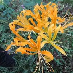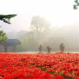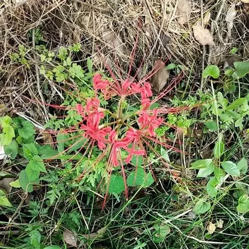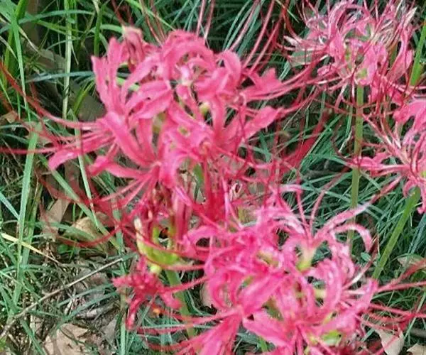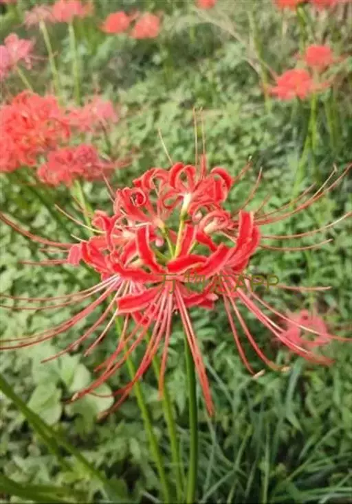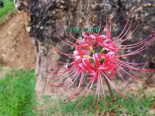石蒜(学名:Lycoris radiata (L’Her.) Herb.):鳞茎近球形。秋季出叶,叶狭带状,顶端钝,深绿色,中间有粉绿色带;花茎高约30厘米;总苞片2枚,披针形;长约35厘米,宽约05厘米;伞形花序有花4-7朵;花鲜红色;花被裂片狭倒披针形,长约3厘米,宽约05厘米,强度皱缩和反卷;花被简绿色,长约05厘米;雄蕊显著伸出于花被外,比花被长1倍左右。花期8-9月,果期10月。