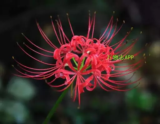 石蒜是多年生草本植物,鳞茎近球形,直径1-3厘米。秋季出叶,叶狭带状,长约15厘米,宽约0.5厘米,顶端钝,深绿色,中间有粉绿色带。花茎高约30厘米;总苞片2枚,披针形,长约35厘米,宽约05厘米;伞形花序有花4-7朵,花鲜红色;花被裂片狭倒披针形,长约3厘米,宽约05厘米,强度皱缩和反卷,花被简绿色,长约05厘米;雄蕊显著伸出于花被外,比花被长1倍左右。花期8-9月,果期10月。