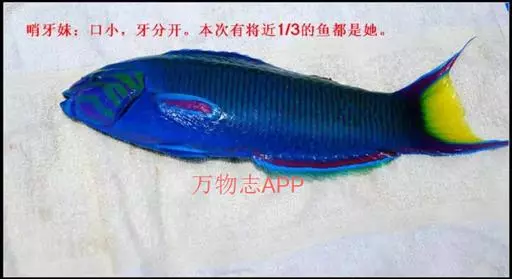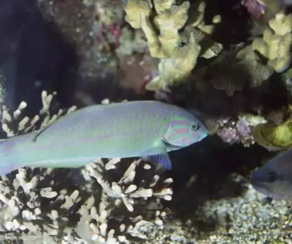体侧扁。幼鱼背部黄而腹部白,背鳍与尾柄具黑斑;雌鱼草绿色,头部具粉红放射纹,尾鳍截形;雄鱼为宝蓝色,头部仍有花纹,特征是胸鳍紫红色且尾鳍中央亮黄色。