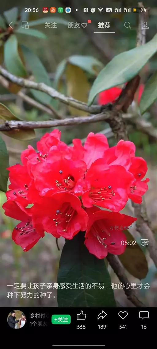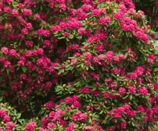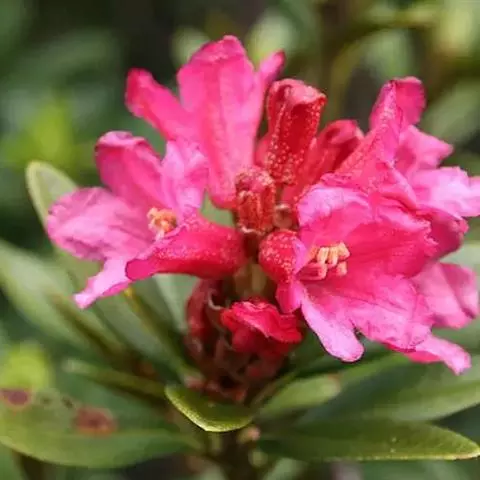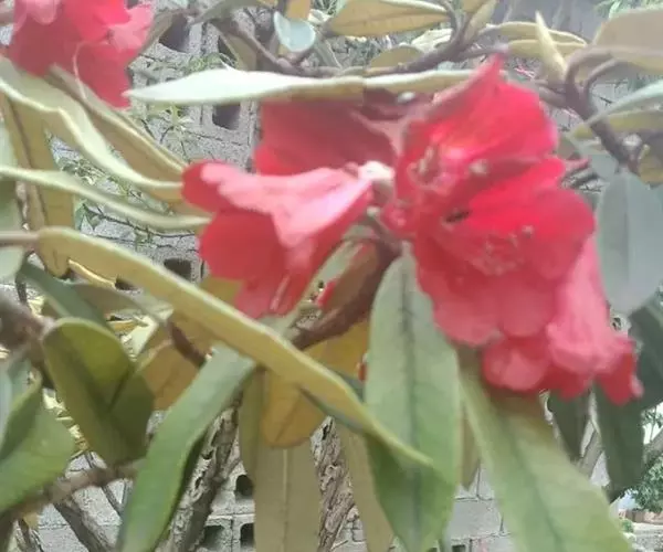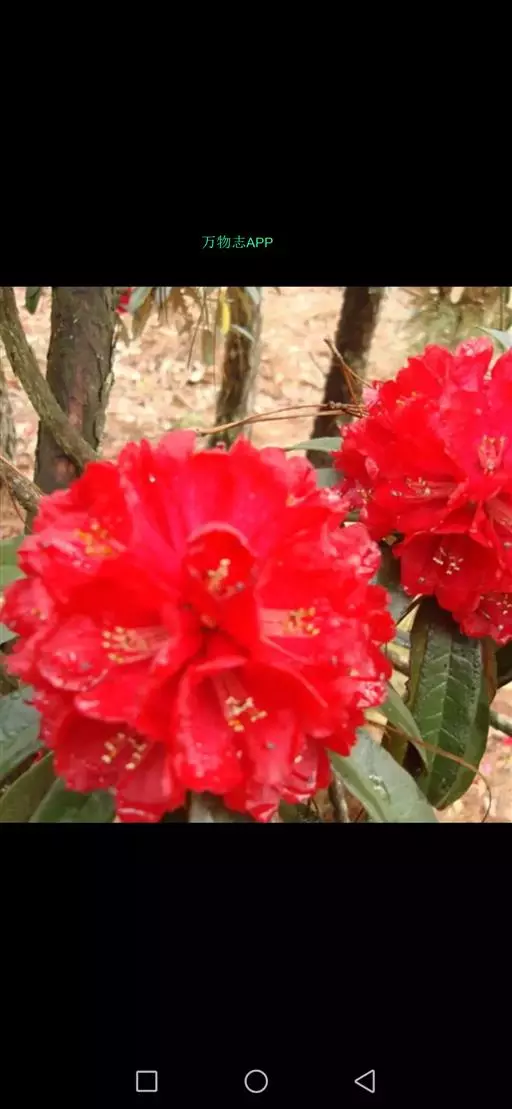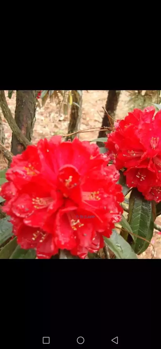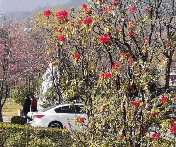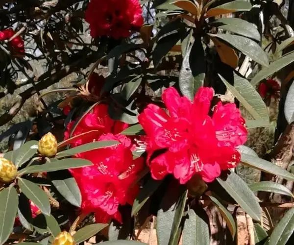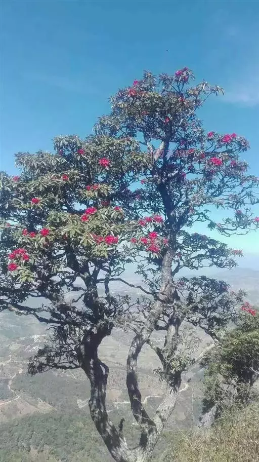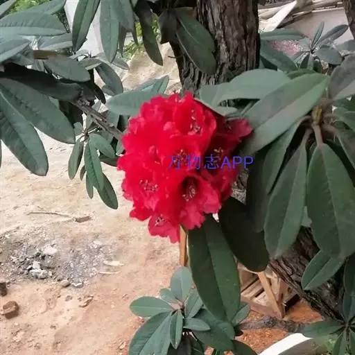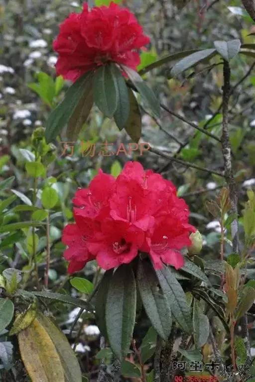 马缨杜鹃(学名:Rhododendron delavayi Franch.):常绿灌木或小乔木,高1-7米;树皮淡灰褐色;幼枝粗壮。顶生冬芽卵圆形,淡绿色。叶革质,长圆状披针形,上面深绿至淡绿色,下面有白色至灰色或淡褐色。顶生伞形花序,圆形,紧密,有花10-20朵;花冠钟形,长3-5厘米,直径3-4厘米,肉质,深红色,裂片5,近于圆形。蒴长圆柱形,黑褐色。花期5月,果期12月。