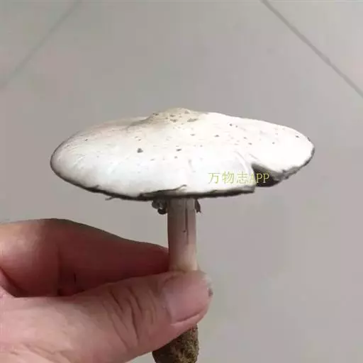 子实体中等至稍大。菌盖直径3-15厘米不等,初半球形,后 大孢花褶伞 近平展,有时中部下凹,白色或乳白色,光滑或后期具丛毛状鳞片,开燥时边缘开裂。菌肉白色,厚。菌褶粉红色呈褐色,黑色,较密,离生,不等长。菌柄粗短,圆柱形,稍弯曲,1-9×0.5-2厘米,近光滑或略有纤毛,白色,内实。菌环单层,白色,膜质,生于菌柄中部,易脱落。担子上有两个担孢子,所以称为双孢蘑菇,孢子印深褐色。孢子褐色,椭圆形,光滑,6.5-10×5-6.5微米。