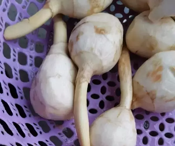 采收时间因地区不同而异。山东一带自秋季初霜后(茎叶枯黄时)到第2年球茎发芽前,即11月至翌年3月,可随时采收,在霜降到大雪期间采收较多,在地上部茎叶刚枯黄时采收产量较低,一般延迟采收产量高。这是因为茎叶刚枯黄时,短缩茎中的养分仍可继续向球茎输送,使球茎继续膨大,从而增加产量。所以,在10月底到11月初排去田水,并割去慈姑叶片,留茬15厘米左右。割叶后每隔2m开沟,沟深30厘米左右,畦面晒干并整细,套种越冬青菜,既可增加慈姑产量,又可在1-2月蔬菜淡季供应上市,提高经济效益。