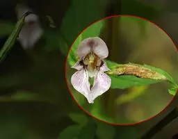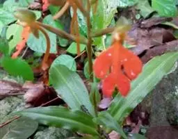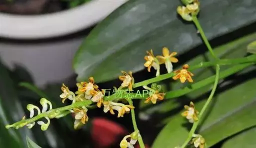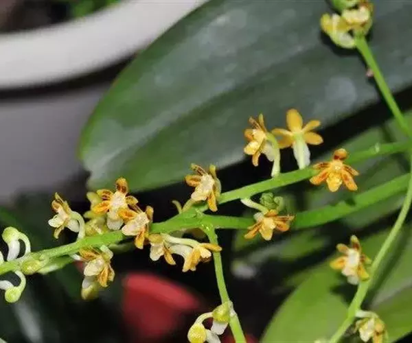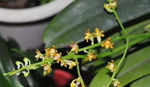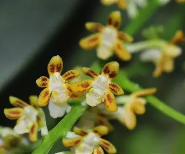 花序出自叶腋,比叶长,多分枝;花序柄粗壮,圆锥花序疏生许多花;花苞片小,卵状披针形,长1-2毫米,先端渐尖;花梗和子房长4毫米;萼片和花瓣黄色带褐红色斑点;中萼片近长圆形,凹下呈舟状,长约3.5毫米,宽2.5毫米,先端钝;侧萼片稍斜长圆形,与中萼片近等大,先端圆形,基部贴生于蕊柱足。