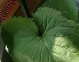 基部叶卵状披针形,花期枯萎;中部叶卵圆形或卵形,开展,长3.5-12厘米,宽1.8-6厘米,基部宽楔形,下延成具翼而长1-3厘米的柄,先端渐尖,边缘有尖头状规则或不规则的粗齿;上部叶渐小,披针形或卵状披针形;全部叶上面深绿色,下面淡绿色,基出三脉,侧脉和网脉明显,两面被平伏短柔毛,沿脉有长柔毛。