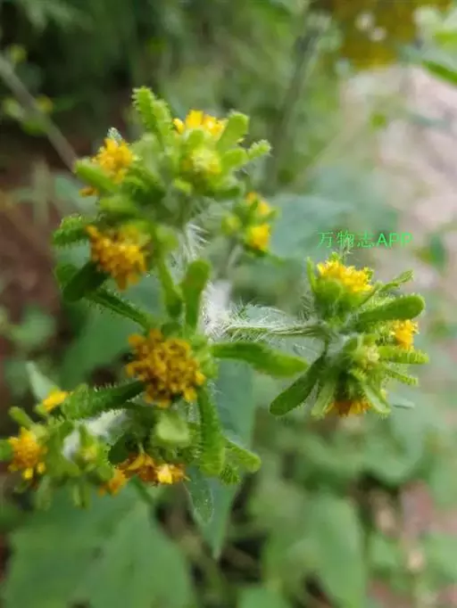 头状花序径约18-22毫米,多数生于枝端,排列成松散的圆锥花序;花梗较长,密生紫褐色头状具柄腺毛和长柔毛;总苞宽钟状;总苞片2层,叶质,背面密生紫褐色头状具柄腺毛,外层线状匙形或宽线形,长7-14毫米,内层卵状长圆形,长3.5毫米。舌状花花冠管部长1-1.2毫米,舌片先端2-3齿裂,有时5齿裂;两性管状花长约2.5毫米,冠檐钟状,先端4-5裂。