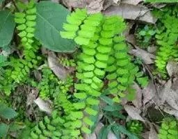团羽铁线蕨 陆生中小形蕨类,体形变异很大。根状茎或短而直立或细长横走,具管状中柱, 植株高8-15厘米。根状茎短而直立,被褐色披针形鳞片。叶簇生;柄长2-6厘米,粗约0.5厘米,纤细如铁丝,深栗色,有光泽,基部被同样的鳞片,向上光滑;叶片披针形,长8-15厘米,宽2.5-3.5厘米,奇数一回羽状;羽片4-8对,下部的对生,上部的近对生,斜向上,具明显的柄,(长约3厘米),柄端具关节,羽片干后易从柄端脱落而柄宿存,两对羽片相距1.5-2厘米,彼此疏离,下部数对羽片大小几相等,长11-1.6厘米,宽1.5-2厘米,团扇形或近圆形,基部对称,圆楔形或圆形,两侧全缘,上缘圆形,能育羽片具2-5个浅缺刻,不育部分具细齿牙;不育羽片上缘具细齿牙;上部羽片、顶生羽片均与下部羽片同形而略小。叶脉多回二歧分叉,直达叶边,两面均明显。叶干后膜质,草绿色,两面均无毛;羽轴及羽柄均为栗色,有光泽,叶轴先端常延伸成鞭状,能着地生根,行无性繁殖。