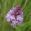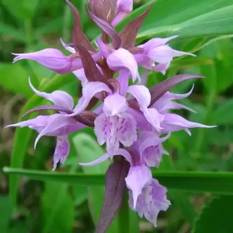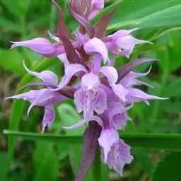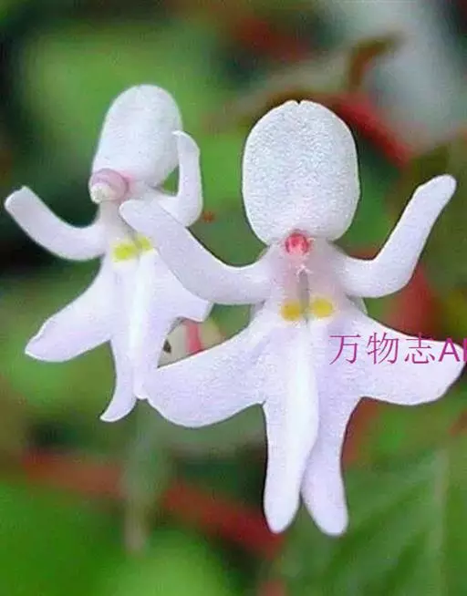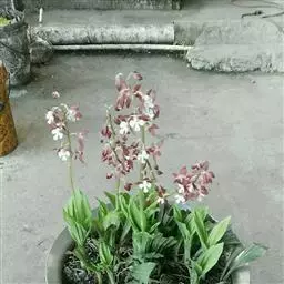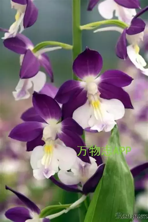 花葶从假茎上端的叶间抽出,长18-30厘米,密被短毛,总状花序长6-8厘米,疏生约10朵花;花苞片宿存,膜质,卵状披针形,长4-7毫米,先端渐尖或急尖,近无毛;花梗和子房长6-13毫米,弧曲,密被短毛,子房棒状;花瓣有多种颜色,尤其在日本,园艺品种很多,花朵极漂亮。萼片褐紫色;中萼片稍斜的椭圆形,长11-13毫米,中部宽6-7毫米,先端急尖,具5条脉,背面中部以下被短毛;侧萼片相似于中萼片。