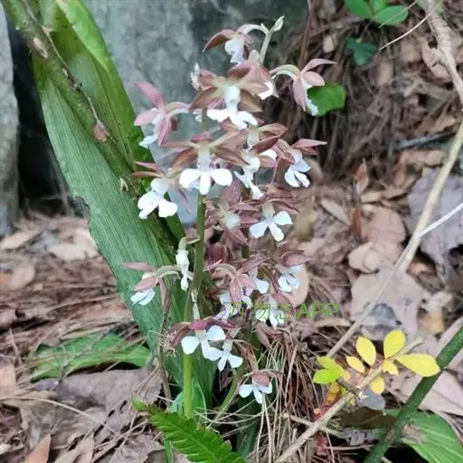 虾脊兰(学名:Calanthe discolor Lindl.):根状茎不甚明显。假鳞茎粗短,近圆锥形,粗约1厘米,具3-4枚鞘和3枚叶。叶在花期全部未展开,倒卵状长圆形至椭圆状长圆形,背面密被短毛。花葶从假茎上端的叶间抽出,密被短毛,总状花序长6-8厘米,疏生约10朵花;萼片和花瓣褐紫色;唇瓣白色,轮廓为扇形,与整个蕊柱翅合生,约等长于萼片,3深裂;。花期4-5月。