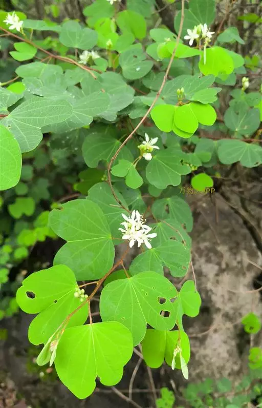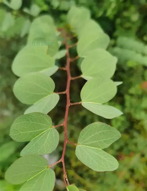 直立或攀援小灌木;小枝纤细,具棱,被微柔毛,很快变秃净。叶纸质或膜质,近圆形,通常宽度大于长度,长3-6厘米,宽4-7厘米,基部近截形、阔圆形或有时浅心形,先端2裂达中部,罅口狭,裂片先端圆钝,上面无毛,下面略被稀疏的微柔毛,多少具松脂质丁字毛;基出脉7-9(-11)条;托叶丝状早落;叶柄纤细,长6-16毫米,具沟,略被微柔毛。伞房式总状花序侧生,连总花梗长1.5-3厘米,有密集的花十余朵;总花梗短,与花梗同被短柔毛;苞片线形,锥尖,早落;花蕾椭圆形,多少被柔毛;花托陀螺形;萼佛焰状,裂片2;花瓣白色,倒披针形,连瓣柄长7-8毫米,具羽状脉;能育雄蕊通常10枚,其中5枚较长,花丝长5-6毫米,无毛;子房被茸毛,具短的子房柄,柱头盾状。荚果长圆形,扁平,长5-7.5厘米,宽9-12毫米,两端渐狭,中部两荚缝近平行,先端具短喙,成熟时开裂,果瓣革质,初时被短柔毛,渐变无毛,平滑,开裂后扭曲;种子2-4颗,卵形,略扁平,褐色,有光泽。花期5-7月;果期8-10月。 [2-3]