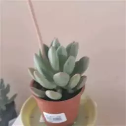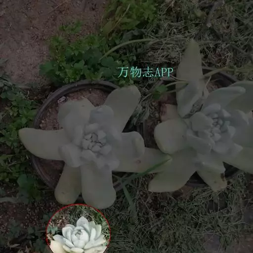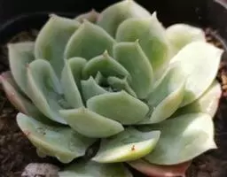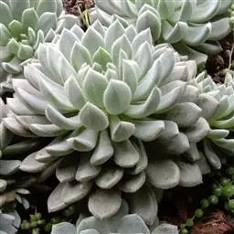霜之朝(xPachyveria 'Powder Puff')是景天科的多肉植物,是一个源自美国的杂交品种,于1970年代被培育。由厚叶草属的鸡蛋美人(Pachyphytum oviferum)和拟石莲花属 的广寒宫(Echeveria cante)杂交而来。 喜温暖、光照充足、干燥且通风的环境,较耐旱,不耐寒、适应力较强。 叶片表面有一层天然的厚白色霜粉,使植株乍看之下呈现淡蓝色。