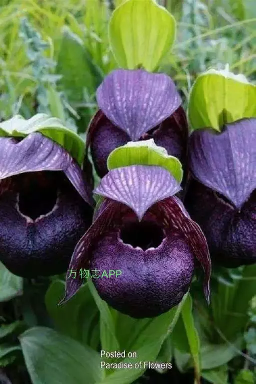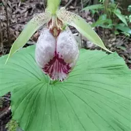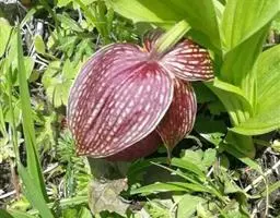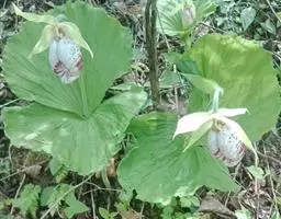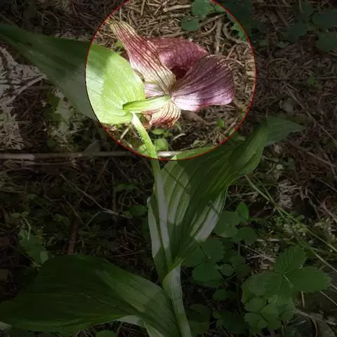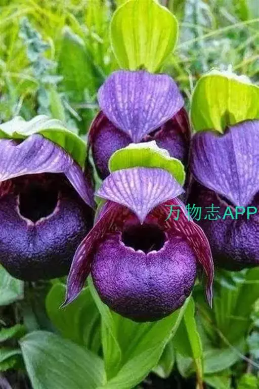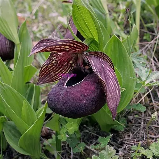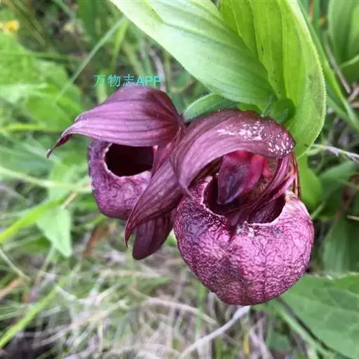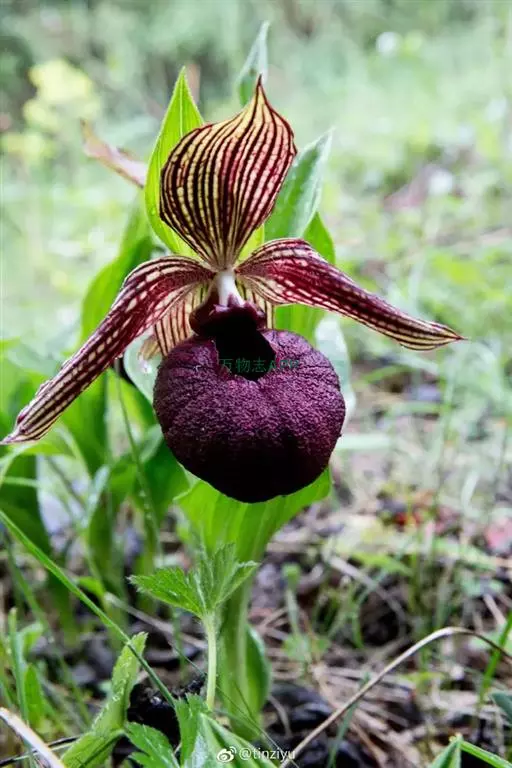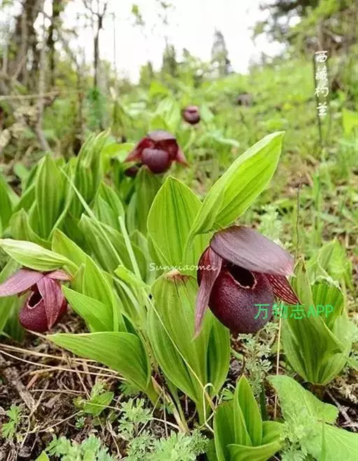 西藏杓兰(学名:Cypripedium tibeticum King ex Rolfe):植株高15-35厘米,具粗壮、较短的根状茎。茎直立,无毛或上部近节处被短柔毛,通常具3枚叶。叶片椭圆形、卵状椭圆形或宽椭圆形。花序顶生,具1花;花苞片叶状,椭圆形至卵状披针形,花大,俯垂,紫色、紫红色或暗栗色,通常有淡绿黄色的斑纹,花瓣上的纹理尤其清晰,唇瓣的囊口周围有白色或浅色的圈;中萼片椭圆形或卵状椭圆形;花瓣披针形或长圆状披针形,长3.5-6.5厘米,宽1.5-2.5厘米,先端渐尖或急尖,内表面基部密生短柔毛,边缘疏生细缘毛;唇瓣深囊状,近球形至椭圆形。花期5-8月。