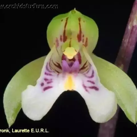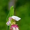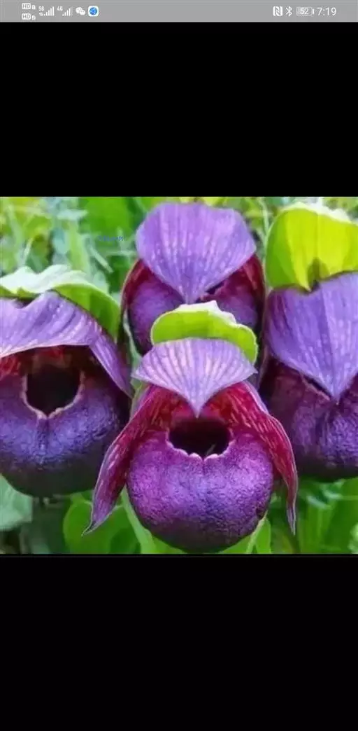 花序顶生,具1花;花苞片叶状,椭圆形至卵状披针形,长6-11厘米,宽2-5厘米,先端急尖或渐尖;花梗和子房长2-3厘米,无毛或上部偶见短柔毛;花大,俯垂,紫色、紫红色或暗栗色,通常有淡绿黄色的斑纹,花瓣上的纹理尤其清晰,唇瓣的囊口周围有白色或浅色的圈;中萼片椭圆形或卵状椭圆形,长3-6厘米,宽2.5-4厘米,先端渐尖、急尖或具短尖头,背面无毛或偶见疏微柔毛,边缘多少具细缘毛;合萼片与中萼片相似,但略短而狭,先端2浅裂。