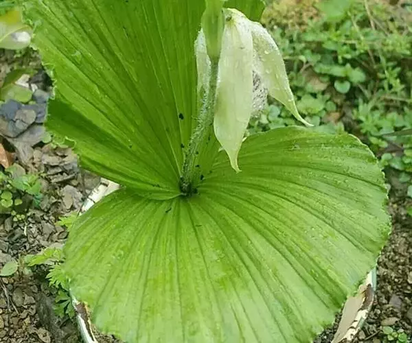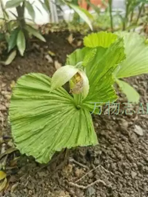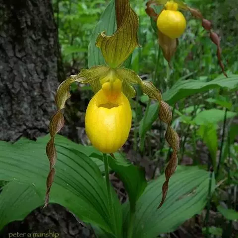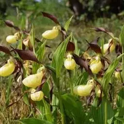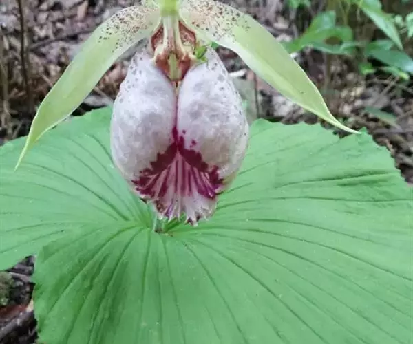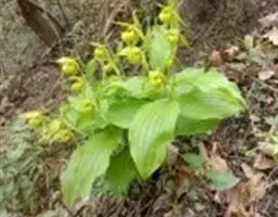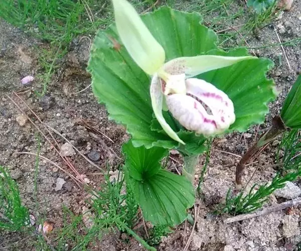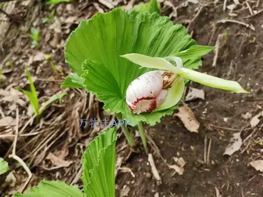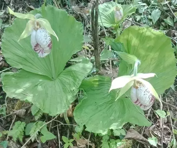 扇脉杓兰(学名:Cypripedium japonicum Thunb.):植株高35-55厘米,具较细长的、横走的根状茎;茎直立,被褐色长柔毛,基部具数枚鞘,顶端生叶。叶通常2枚,近对生,位于植株近中部处,叶片扇形。花序顶生,具1花;花俯垂;萼片和花瓣淡黄绿色,基部多少有紫色斑点,唇瓣淡黄绿色至淡紫白色,多少有紫红色斑点和条纹;花瓣斜披针形,长4-5厘米,宽1-1.2厘米,先端渐尖,内表面基部具长柔毛;唇瓣下垂,囊状,近椭圆形或倒卵形。蒴果近纺锤形,疏被微柔毛。花期4-5月,果期6-10月。