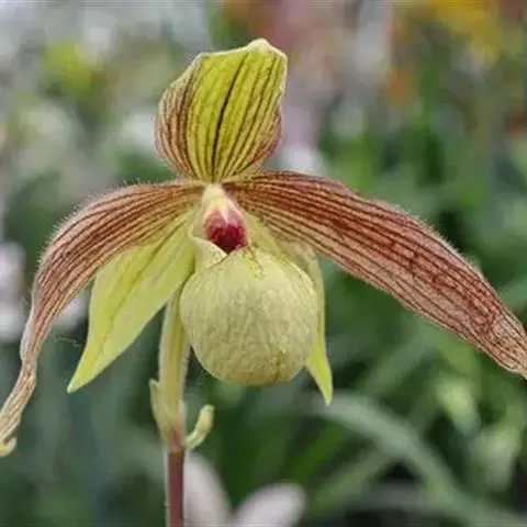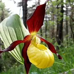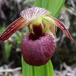 大花杓兰因其形状酷似一个口小肚大的囊袋,又名“大口袋兰”。花体呈紫红色,花朵直径5厘米至6厘米,…