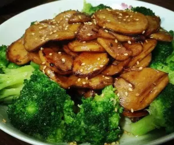 杏鲍菇炒西兰花 杏鲍菇1根、西兰花150克、黑木耳150克、胡萝卜80克、姜10克、盐3克、素蠔油10毫升