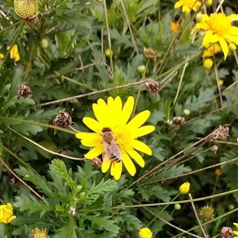 头状花序,总苞黄褐色,半球状,周边花舌状,金黄色,花直径约3cm。株型紧凑,不断分枝,不断抽生花序,故花多繁盛,开花不绝。