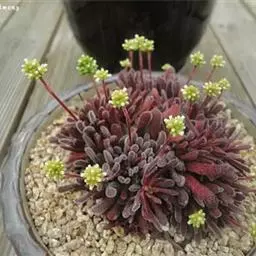 叶子表面宽厚,富肉质感且带有磨纱质感,看像石头质地;开红色小花,生于植株顶部,倒伞形密生,形状像花…