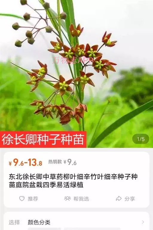 徐长卿 ,学名 Cynanchum paniculatum (Bunge) Kitagawa,英文名:RADIX CYNANCHI PANICULATI。竹叶细辛。多年生直立草本。种子长圆形花期5~7月,果期9~12 月。多生于阳坡草丛中。分布于黑龙江、吉林、辽宁、河北、河南、 山东、内蒙、江苏、浙江、江西、 福建、湖北、湖南、广东、广西、陕西、甘肃、四川、贵州、云南等省区。有极高的药用价值。