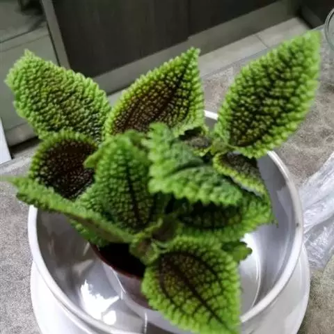 植株细小,具粗壮肥大的肉质根状茎,根状茎匍匐生长,有极短的节,叶和花均从根状茎上长出,在靠近土面处长成一蔟。其叶片卵圆形,具长柄,叶柄绿色,有红褐色斑点,叶长约4 厘米,叶面暗红褐色,有不规则的绿色斑块,叶缘具白毛。花粉白色,不甚显著。其叶片斑斓,株形紧凑,是优良的观叶植物,宜用小盆栽种,点缀窗台、几案、书桌等处。