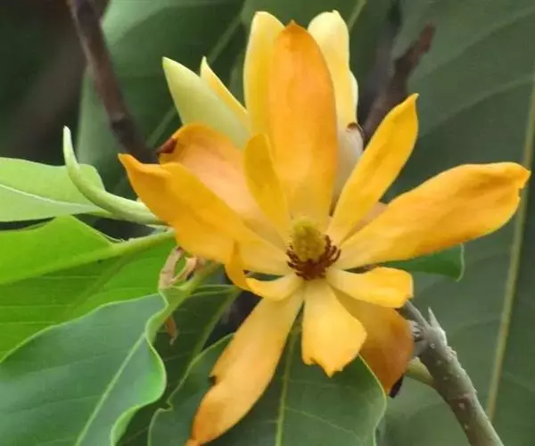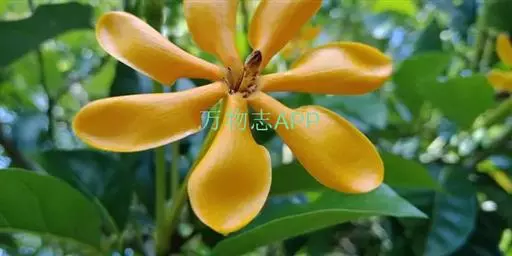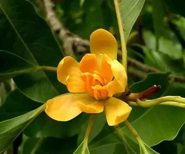 黄兰(Michelia champaca Linn.):常绿乔木,高达10余米;枝斜上展,呈狭伞形树冠;芽、嫩枝、嫩叶和叶柄均被淡黄色的平伏柔毛。叶薄革质,披针状卵形或披针状长椭圆形,下面稍被微柔毛。花黄色,极香,花被片15-20片,倒披针形,长3-4厘米,宽4-5毫米;蓇葖倒卵状长圆形,长1-1.5厘米,有疣状凸起;种子2-4枚,有皱纹。花期6-7月,果期9-10月。