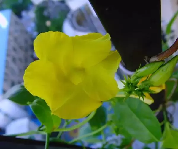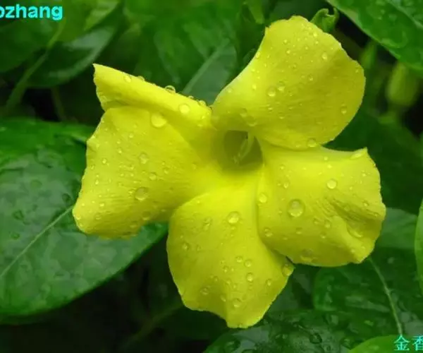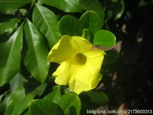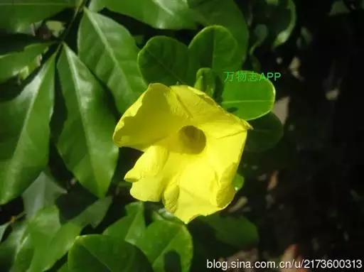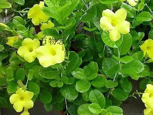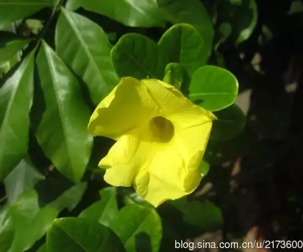 常绿藤本,茎有白色乳汁。叶对生,椭圆形,全缘,革质,富有光泽。花冠黄色,漏斗形。