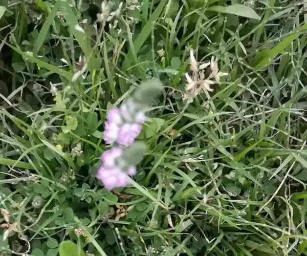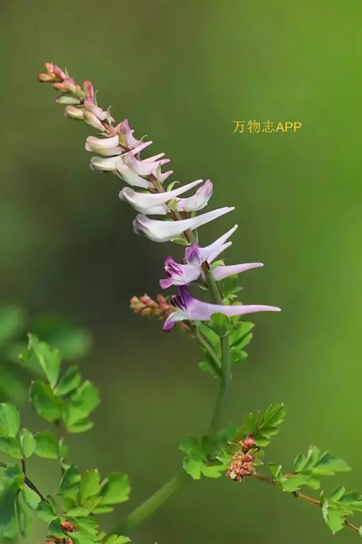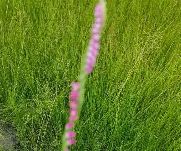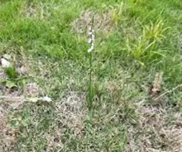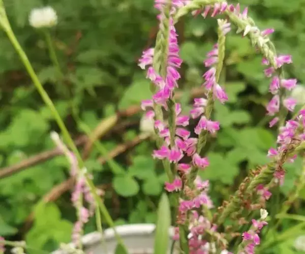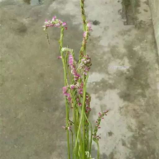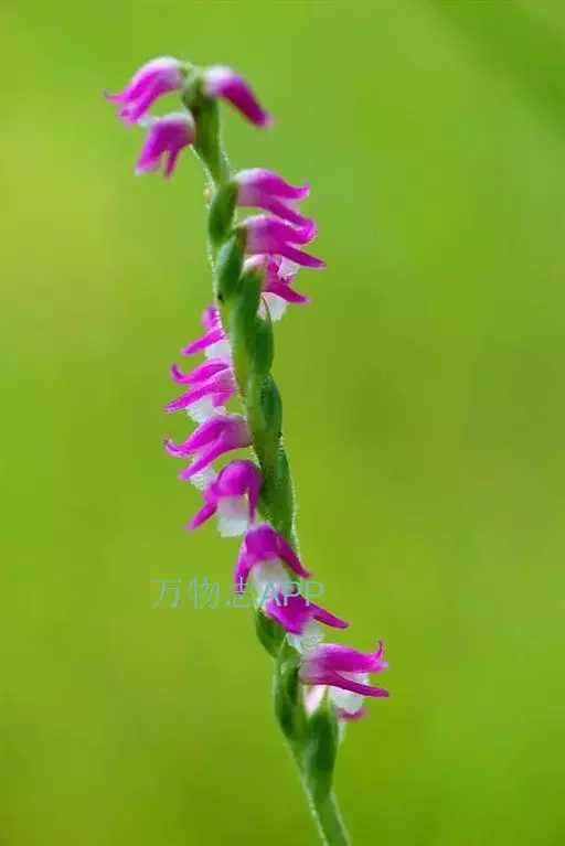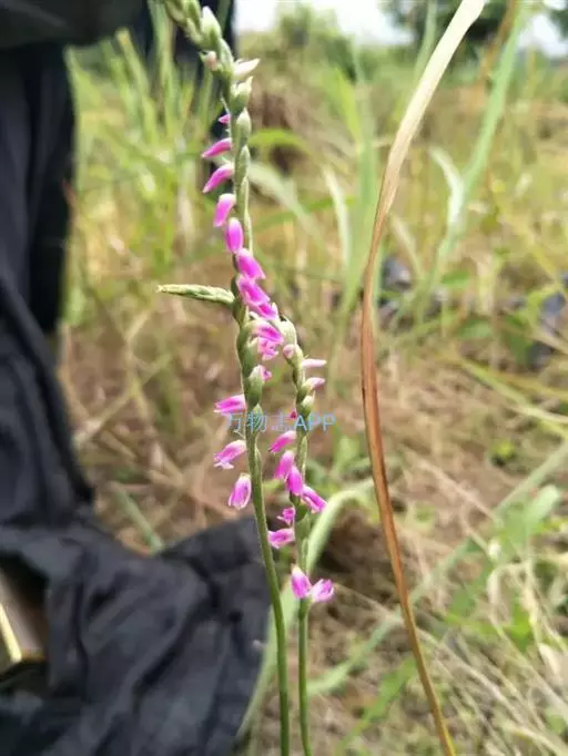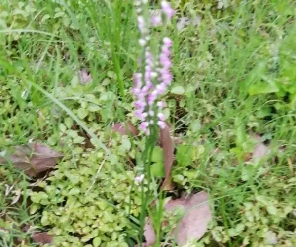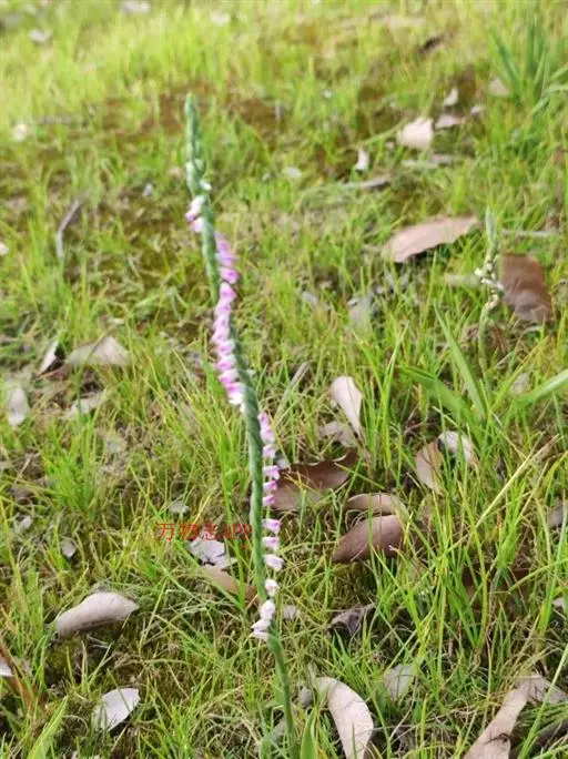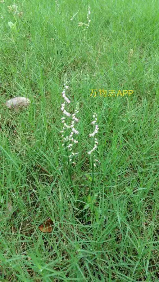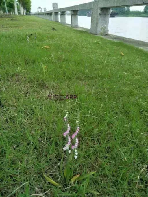 绶草(学名:Spiranthes sinensis (Pers.) Ames):植株高13-30厘米。根数条,指状,肉质,簇生于茎基部。茎较短,近基部生2-5枚叶。叶片宽线形或宽线状披针形,极罕为狭长圆形,直立伸展。花茎直立,长10-25厘米,上部被腺状柔毛至无毛;总状花序具多数密生的花,长4-10厘米,呈螺旋状扭转;花小,紫红色、粉红色或白色,在花序轴上呈螺旋状排生;萼片的下部靠合,中萼片狭长圆形,舟状,长4毫米,宽1.5毫米,先端稍尖,与花瓣靠合呈兜状。花期7-8月。