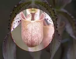 花瓣斜菱状长圆形,先端钝,与中萼片等长但较薄;唇瓣宽长圆形,凹陷,长4毫米,宽2.5毫米,先端极钝,前半部上面具长硬毛且边缘具强烈皱波状啮齿,唇瓣基部凹陷呈浅囊状,囊内具2枚胼胝体。花期7-8月。