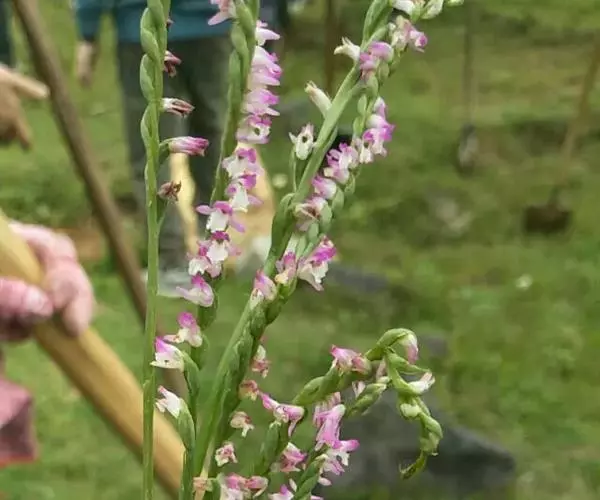花茎直立,长10-25厘米,上部被腺状柔毛至无毛;总状花序具多数密生的花,长4-10厘米,呈螺旋状扭转;花苞片卵状披针形,先端长渐尖,下部的长于子房;子房纺锤形,扭转,被腺状柔毛,连花梗长4-5毫米;花小,紫红色、粉红色或白色,在花序轴上呈螺旋状排生;萼片的下部靠合,中萼片狭长圆形,舟状,长4毫米,宽1.5毫米,先端稍尖,与花瓣靠合呈兜状;侧萼片偏斜,披针形,长5毫米,宽约2毫米,先端稍尖。
