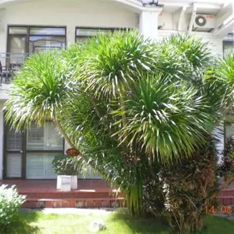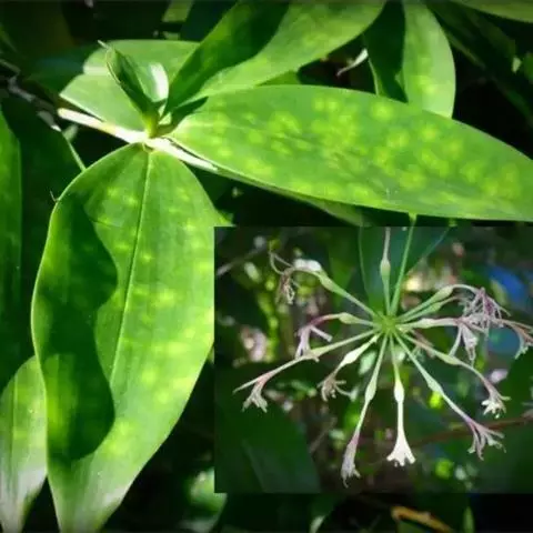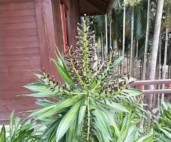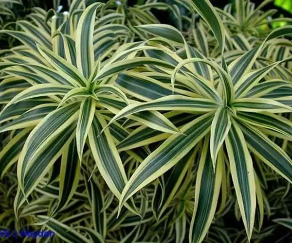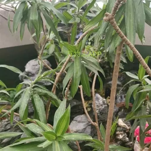 密叶百合竹 多年生长绿灌木或小乔木。叶线形或披针形,全缘,浓绿有光泽,松散成簇;花序单生或分枝,常反折,花白色,为雌雄异株。花序单生或分枝,小花白色。其斑叶品种金边百合竹也见于栽培,叶缘有金黄色纵条纹;金心百合竹,叶缘绿色,中央呈金黄色。