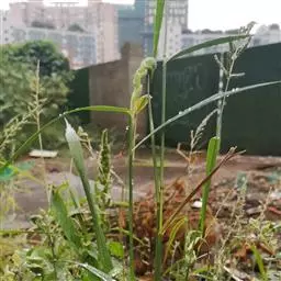 牛筋草(学名:Eleusine indica (L.) Gaertn.),一年生草本。根系极发达。秆丛生,基部倾斜。叶鞘两侧压扁而具脊,松弛,无毛或疏生疣毛;叶舌长约1毫米;叶片平展,线形,无毛或上面被疣基柔毛。穗状花序2-7个指状着生于秆顶,很少单生;小穗长4-7毫米,宽2-3毫米,含3-6小花;颖披针形,具脊,脊粗糙。囊果卵形,基部下凹,具明显的波状皱纹。鳞被2,折叠,具5脉。花果期6-10月。