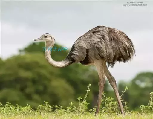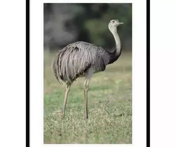 其形态很象非洲鸵鸟,它也有一只细长的腿、细长的头颈,弧形的背脊、徒有其名的翅膀,也是过着一雄多雌的群体生活,雌鸟管生蛋,雄鸟管孵卵。但是它和非洲鸵鸟有区别,一是其脚爪为3趾,而非洲鸵鸟为2趾,二是形体比非洲鸵鸟小,高度通常为1.5米,重20千克,三是羽毛没有非洲鸵鸟长。羽色多按身体部位而异,有的是油滑的棕色,有的是黑色和灰色。