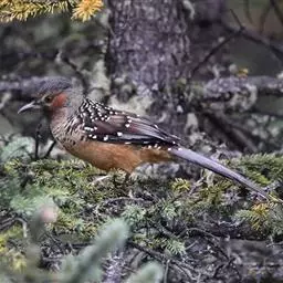 大噪鹛:中型鸟类,体长32-36厘米。额至头顶黑褐色,背栗褐色满杂以白色斑点,…