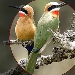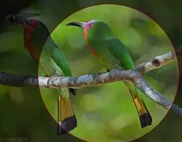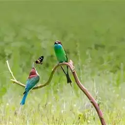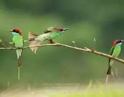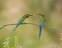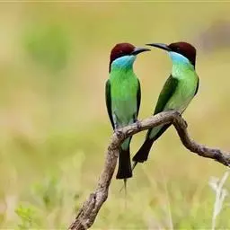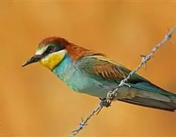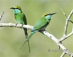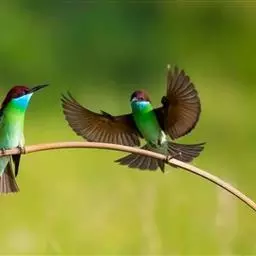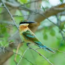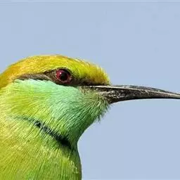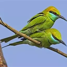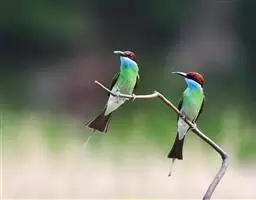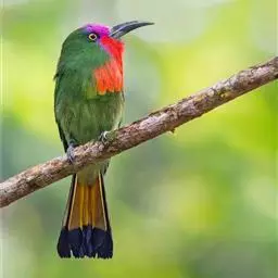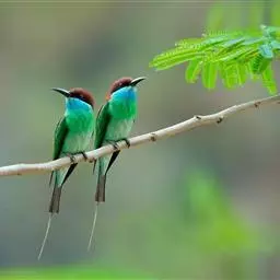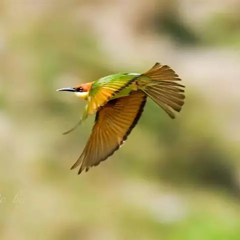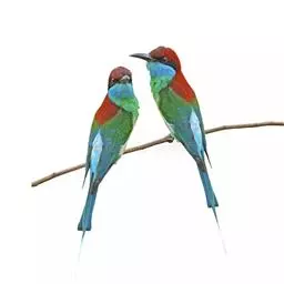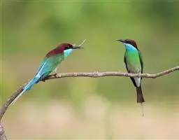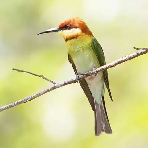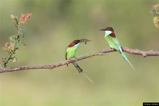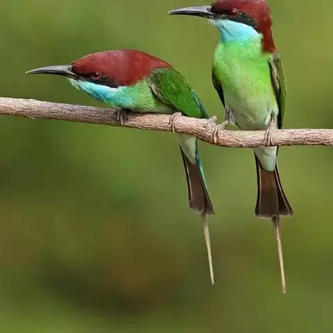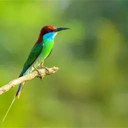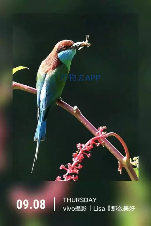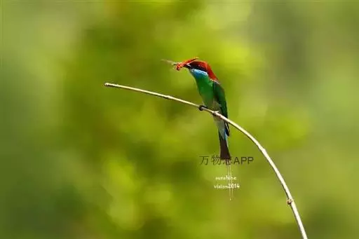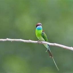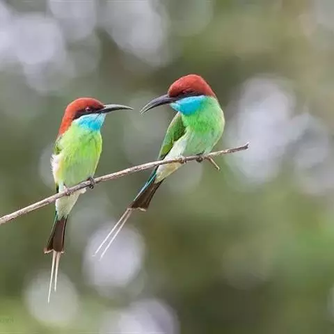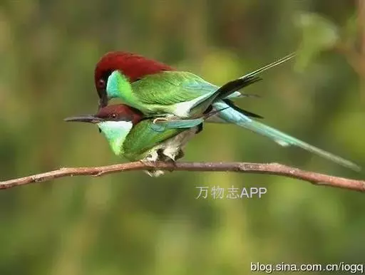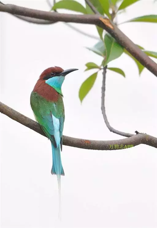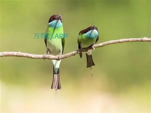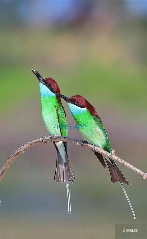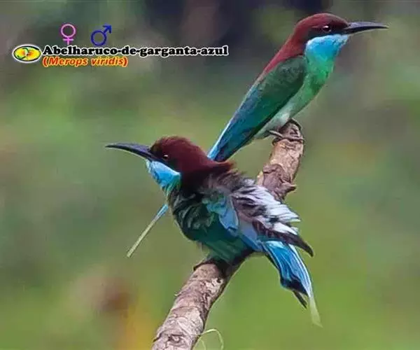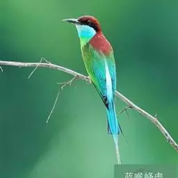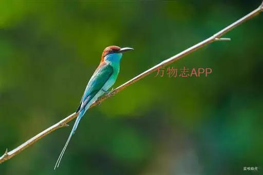 蓝喉蜂虎(学名:Merops viridis)中型鸟类,体长26~28厘米。头顶至上背栗红色或巧克力色,过眼线黑色,腰和尾蓝色,翼蓝绿色,腰及长尾浅蓝,中央尾羽延长成针状,明显突出于外。颏喉蓝色,其余下体和两翅绿色。嘴细长而尖,黑色,微向下曲。