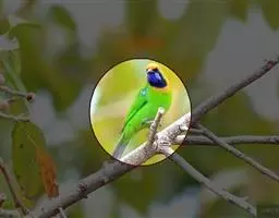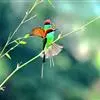 前额、头顶、枕、后颈和上背深栗色,下背蓝绿色,腰天蓝色,尾蓝色,中央尾羽延长,突出约65毫米;肩和翅绿色,内侧飞羽蓝色,贯眼纹黑色,到眼后变宽。颏、喉和颈侧蓝色,胸和上腹绿色,腹淡绿色,尾下覆羽淡蓝色。