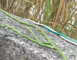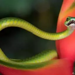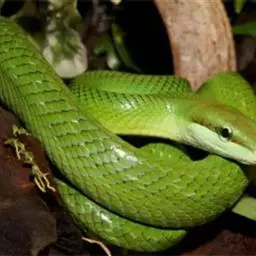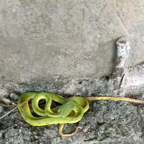 白唇竹叶青(学名:Cryptelytrops albolabris)头部呈三角形,颈细,形似烙铁。头顶具细鳞,吻侧有颊窝。上颌仅具白唇竹叶青管牙,有剧毒。体背鲜绿色,有不明显的黑横带;腹部黄白色。体最外侧自颈达尾部有一条白纹;上唇黄白色。鼻间鳞大;鼻鳞与颊窝间一般无鳞片。