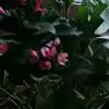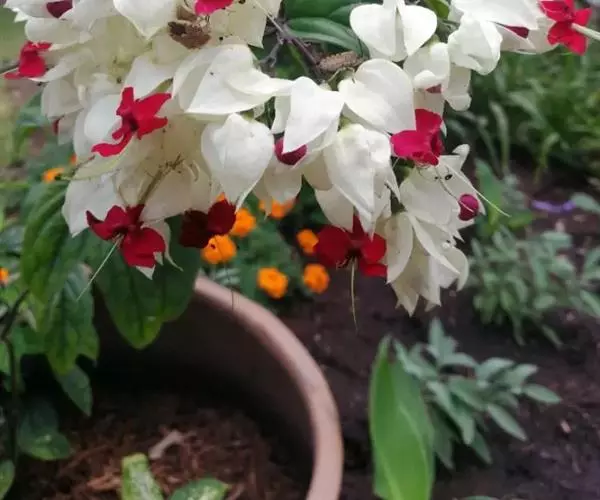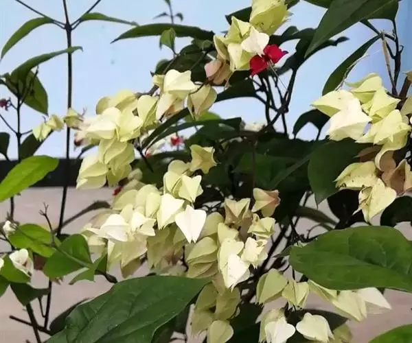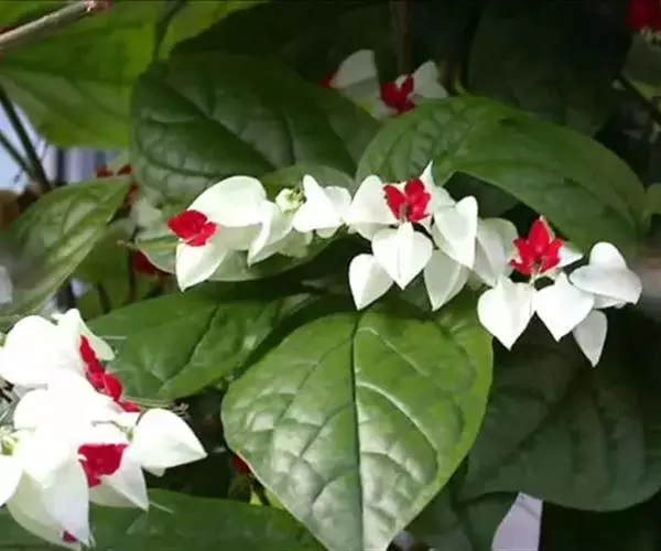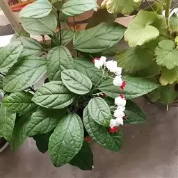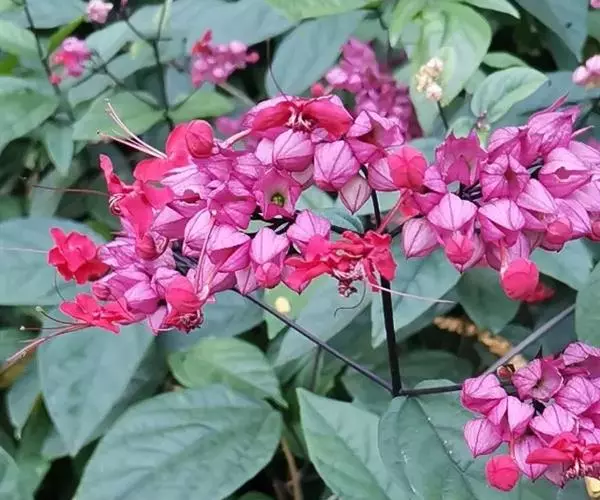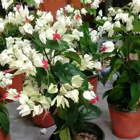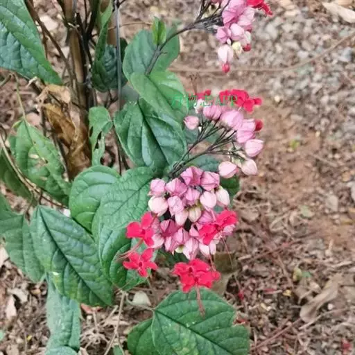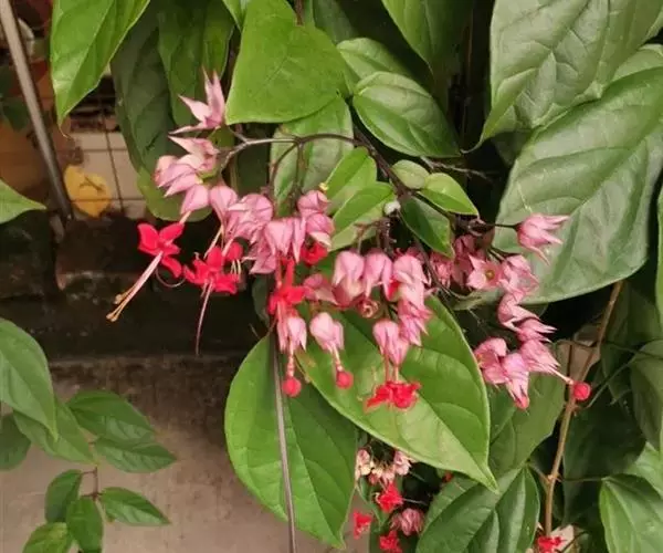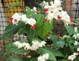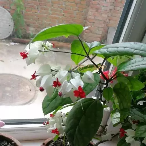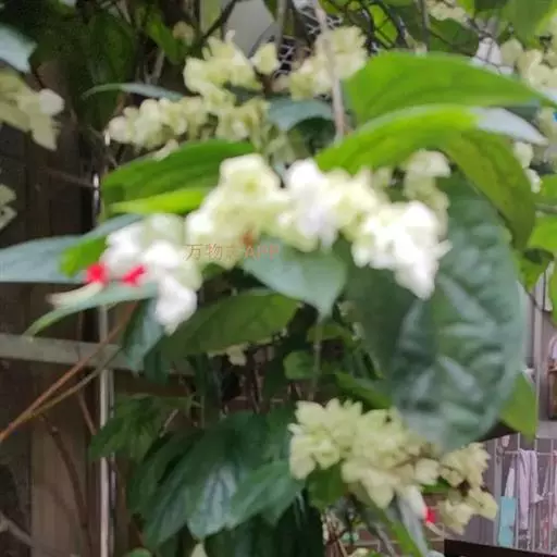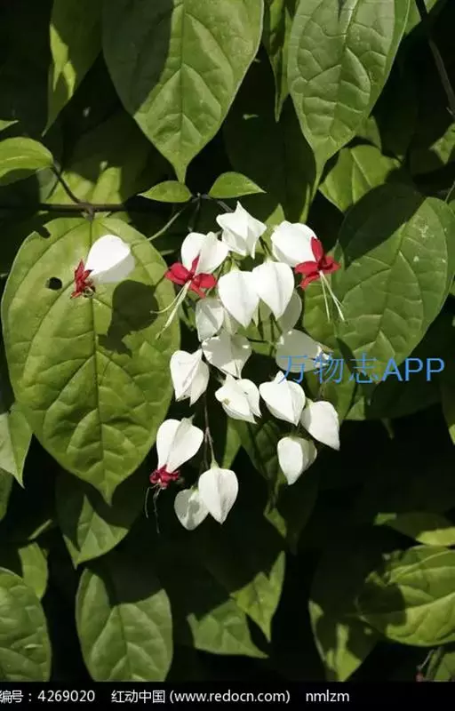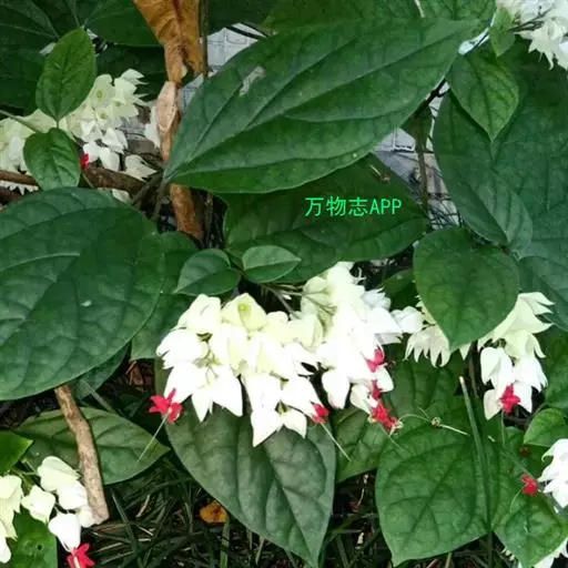 龙吐珠(学名:Clerodendrum thomsonae Balf.):马鞭草科灌木,幼枝四棱形,被黄褐色短绒毛,老时无毛。叶片纸质,狭卵形或卵状长圆形,顶端渐尖,基部近圆形,全缘;聚伞花序腋生或假顶生,二歧分枝;苞片狭披针形;花萼白色,基部合生,中部膨大,裂片三角状卵形,顶端渐尖;花冠深红色,外被细腺毛,裂片椭圆形;雄蕊4,与花柱同伸出花冠外;柱头2浅裂。核果近球形,外果皮光亮,棕黑色;宿存萼不增大,红紫色。花期3-5月。