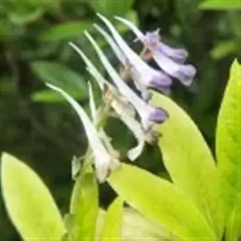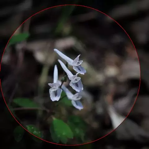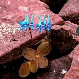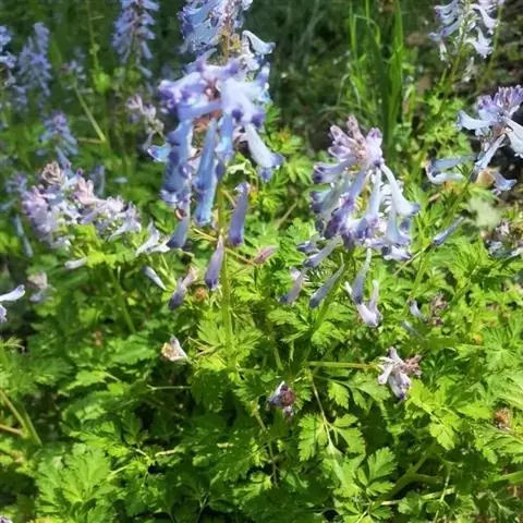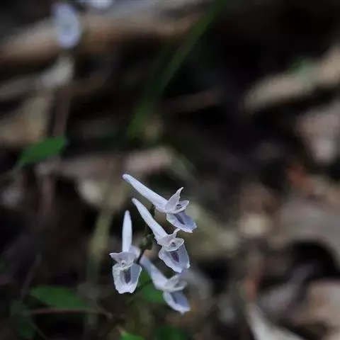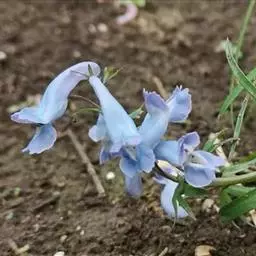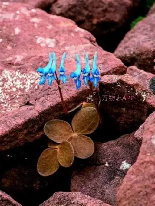 块茎长3-5厘米,圆柱形,分枝或不分枝。茎长10-30厘米,地下部分较长,具2-3鳞片,地上部分分枝,具叶。叶三出,具长柄,基部多少具鞘;小叶肉质,较厚,圆形至椭圆形,无柄或近无柄,长1-2.5厘米,宽约与长相等至较狭其2倍,全缘,上面淡蓝色,下面腊黄状苍白色,具3条纵脉。花序伞房状或近伞形,具3-9花及长3-10厘米的花序轴。苞片倒卵圆形,小而钝,长(3-)5-15毫米。花梗粗而直立,长7-30毫米。萼片近圆形,长约1.5毫米,多少具齿。花蓝白色,蓝色至蓝紫色。外花瓣急尖,常具明显或不明显的鸡冠状突起。上花瓣多少弧形上弯,长(1.6)1.8-2.3厘米;距长1.2-1.5厘米,近直或上弯;蜜腺体约占距长的2/3,末端钝。下花瓣稍向前伸出,瓣片多少下弯,基部具浅囊。内花瓣长9-10毫米。柱头扁四方形,前端具4短柱状乳突。蒴果倒卵圆形,长7-12毫米,宽3-4.5毫米,俯垂于直立的花梗上,具5-10种子和2-3毫米长的花柱。