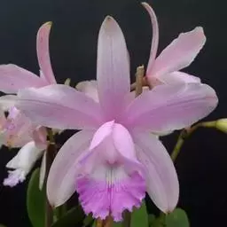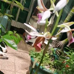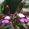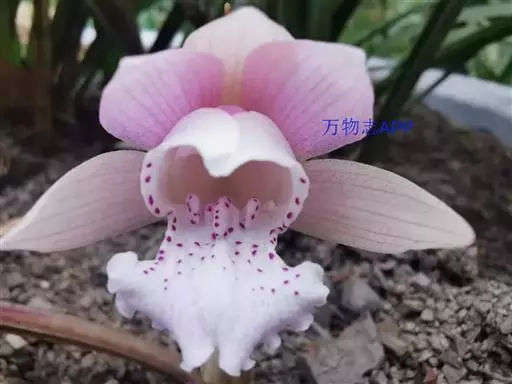 花葶长10-17厘米,紫色,具2枚鞘;鞘膜质,下部抱茎,长3-4厘米;花苞片小,凋落;花梗和子房长7-9毫米;花大,白色而带肉红色或淡紫色晕,唇瓣有紫红色斑点;萼片长圆状披针形,长2.7-3.3厘米,宽7-9毫米,先端钝,有5-7脉;侧萼片稍斜歪。