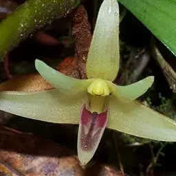 独花兰的假鳞茎近椭圆形或宽卵球形,长1.5-2.5厘米,宽1-2厘米,肉质,近淡黄白色,有2节,被膜质鞘。叶1枚,宽卵状椭圆形至宽椭圆形,长6.5-11.5厘米,宽5-8.2厘米,先端急尖或短渐尖,基部圆形或近截形,背面紫红色;叶柄长3.5-8厘米。