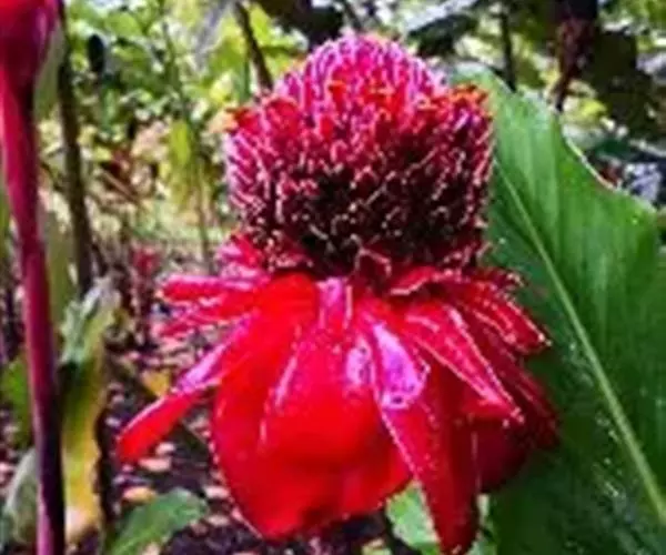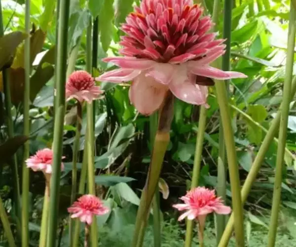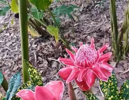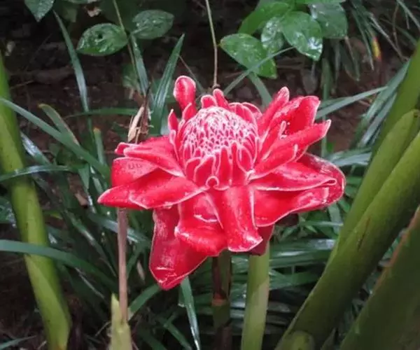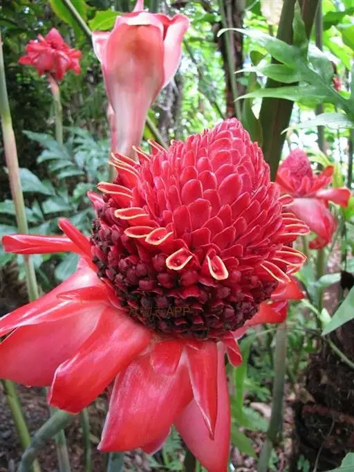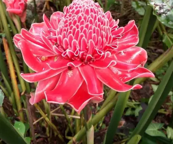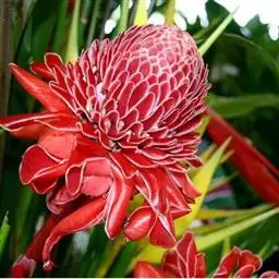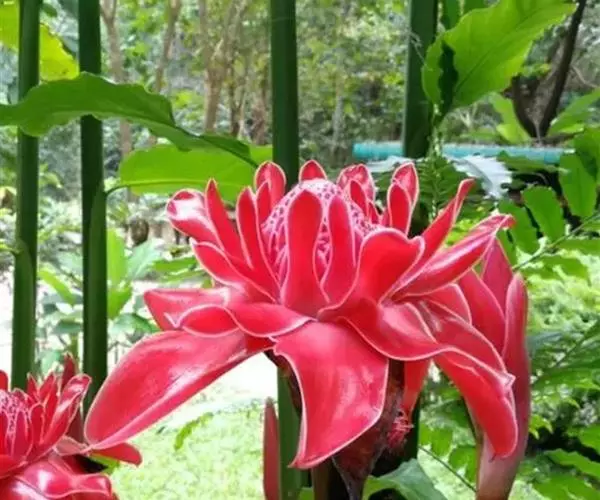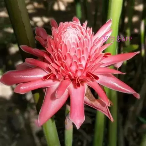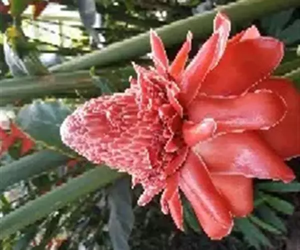 瓷玫瑰(学名:Etlingera elatior)是姜科艳山姜属多年生草本植物,植株丛生,株高3-7米,叶互生,二行排列,长圆状披针形,叶色深绿,光滑,长50厘米左右,宽15厘米左右,头状花序由地下茎抽出,玫瑰花型,花瓣革质,表面光滑,亮丽如瓷,有50-100瓣不等。花期夏季。