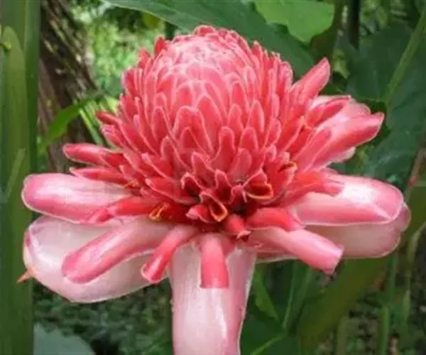 多年生草本植物。瓷玫瑰一般茎枝成丛生长,在原产地株高可达10米以上,在我国栽培一般仅2~5米。茎秆 被叶鞘所包。叶互生,2行排列,叶片绿色,线形至椭圆形或椭圆状披针形,叶长30~60厘米,光滑,有光泽。花为基生的头状花序,圆锥形球果状,似熊熊燃烧的火炬,故名火炬姜;花序在春夏秋三季从地下茎抽出,高可达1~2米,直径约为15~20厘米,花柄粗壮;苞片粉红色,肥厚,瓷质或蜡质,有光泽,层层叠嶂;花上部唇瓣金黄色,十分妖娆艳丽,又似含苞待放的玫瑰,故又名瓷玫瑰。瓷攻瑰常年可看到花朵的盛花期为5~10月。瓷玫瑰还有1个变种,其茎秆、叶片均为紫红色,花朵为深红色,较为稀有。